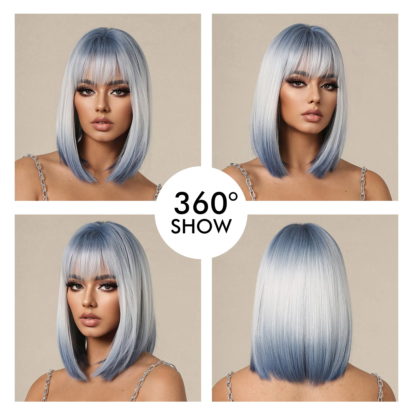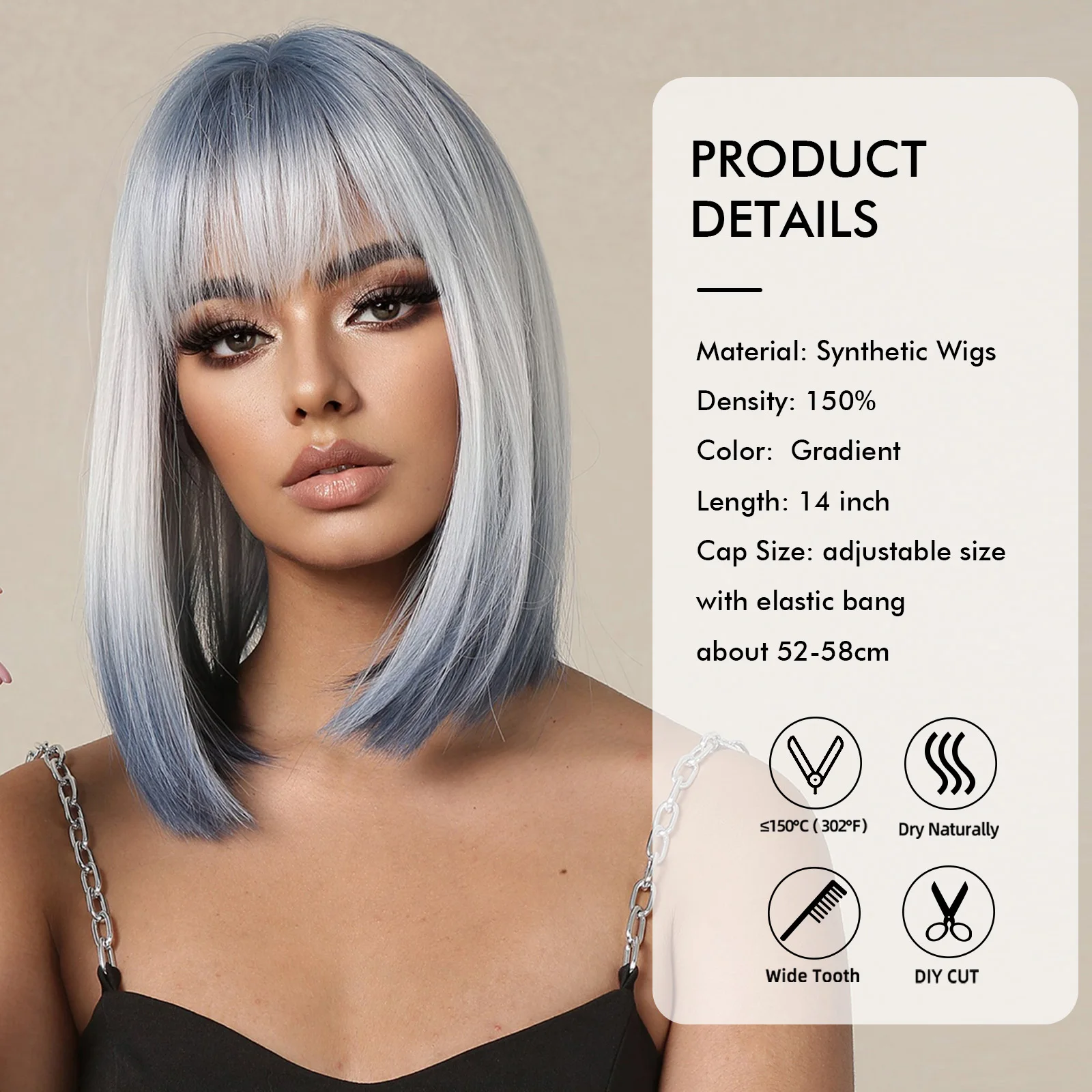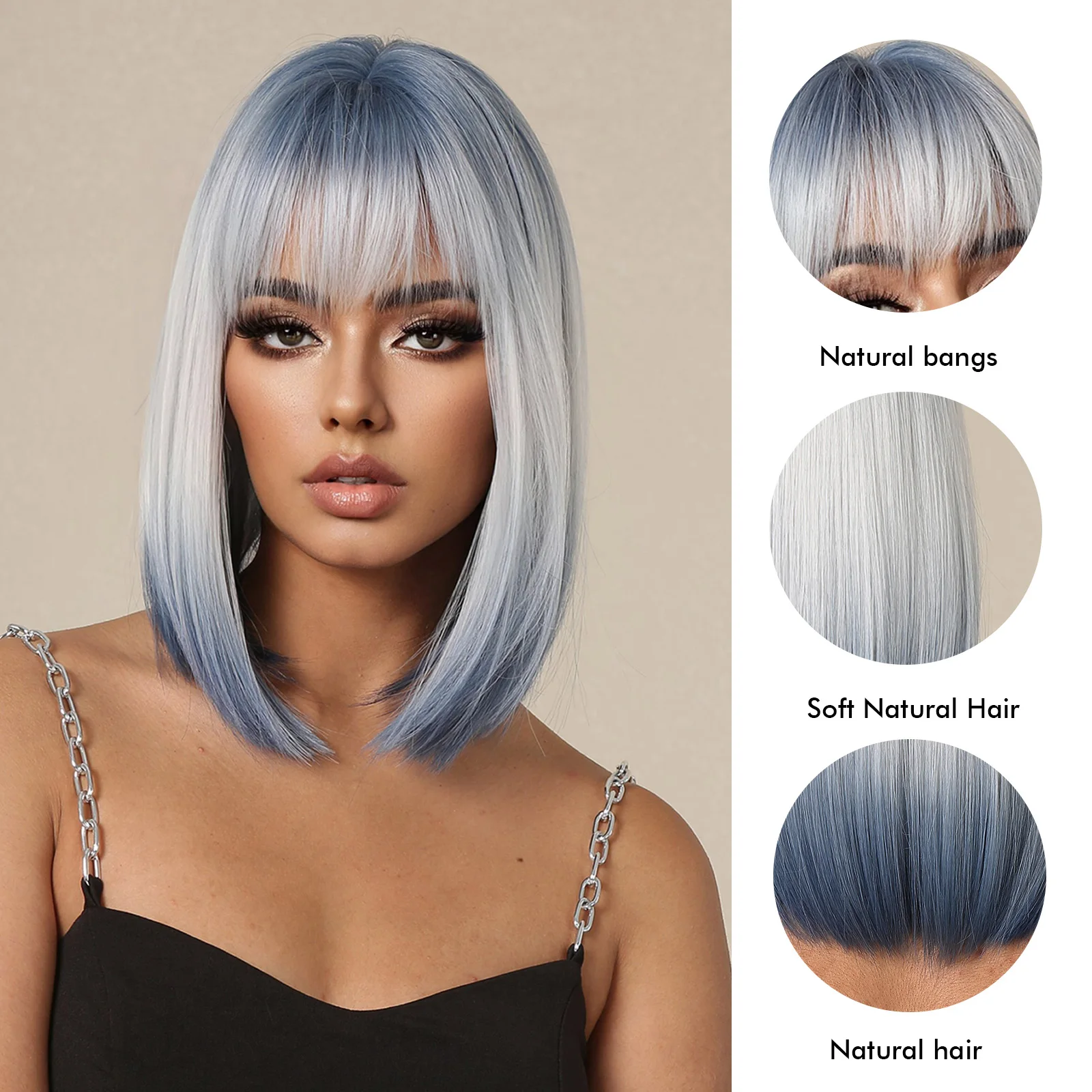 Short BOB Wigs with Bangs Ombre Blue Gray Wigs Straight Synthetic Wigs for Women Cosplay Party Daily