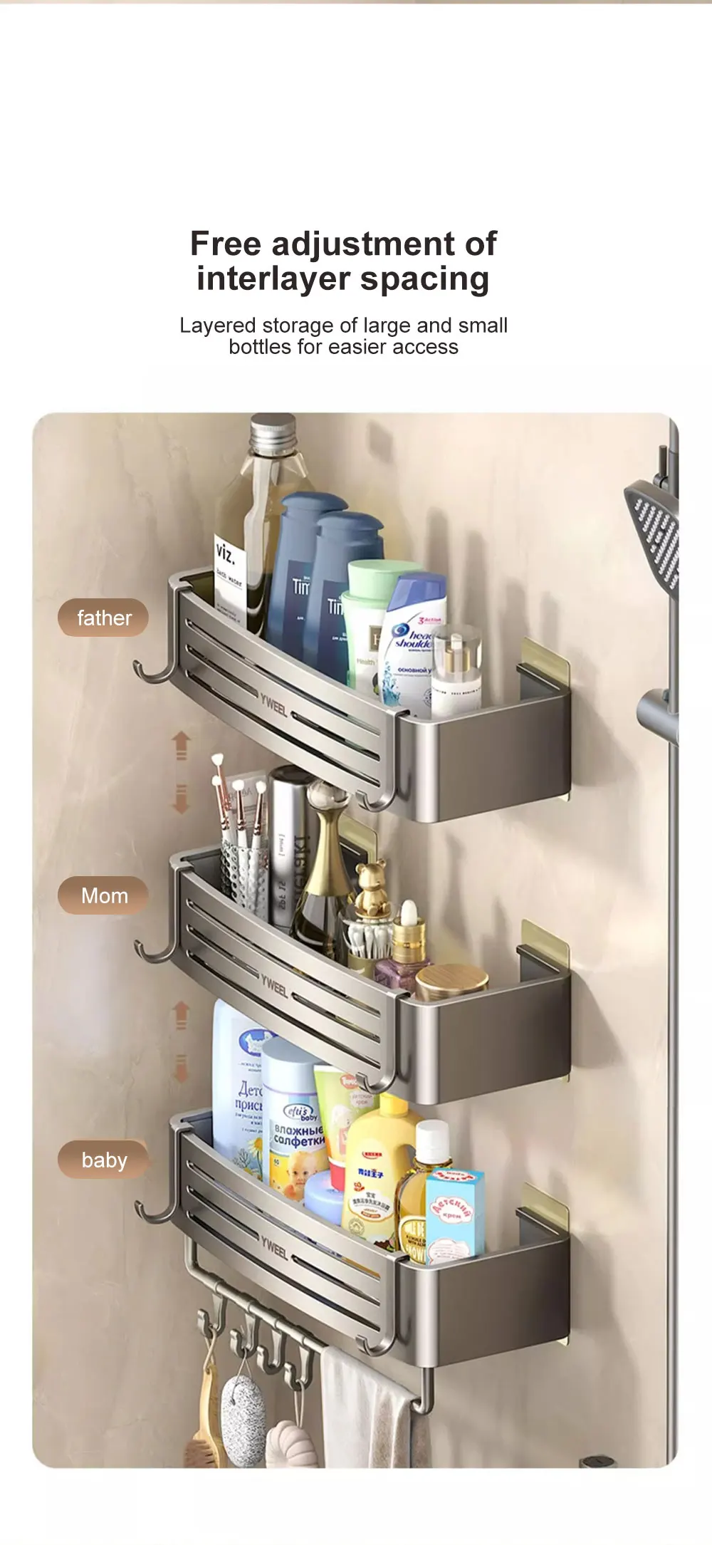 Designed to optimize storage capacity, our corner shelf provides ample space for a variety of bathroom essentials, freeing up valuable bathroom space. It features a multi-tiered design where each tier can be adjusted in height as needed to accommodate items of different sizes and shapes. Each shelf comes with two hooks and a towel rack for added convenience.