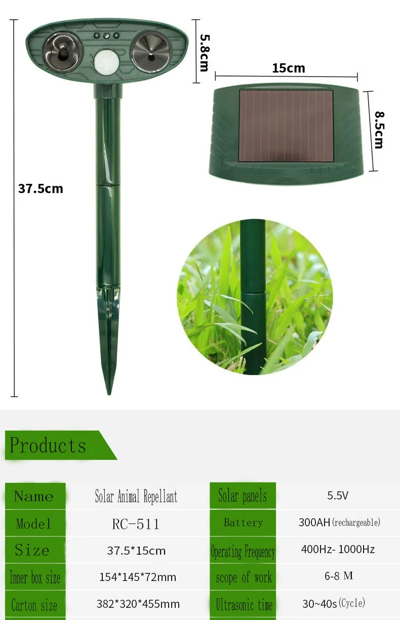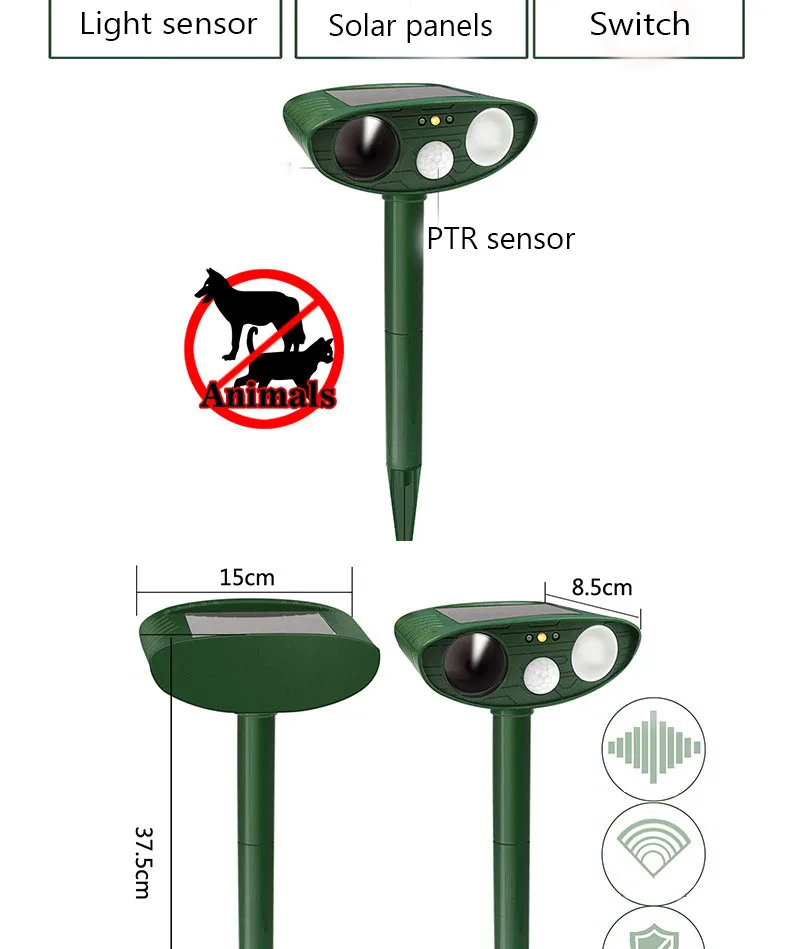 • Solar Powered :This repellent is powered by solar energy, making it eco-friendly and cost-effective as it doesn't require any electricity or batteries.