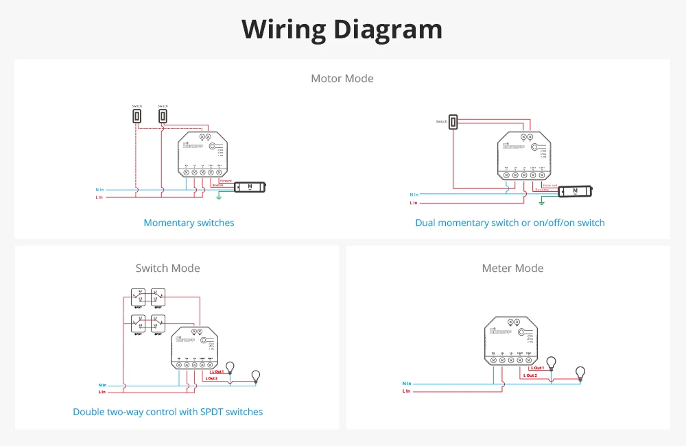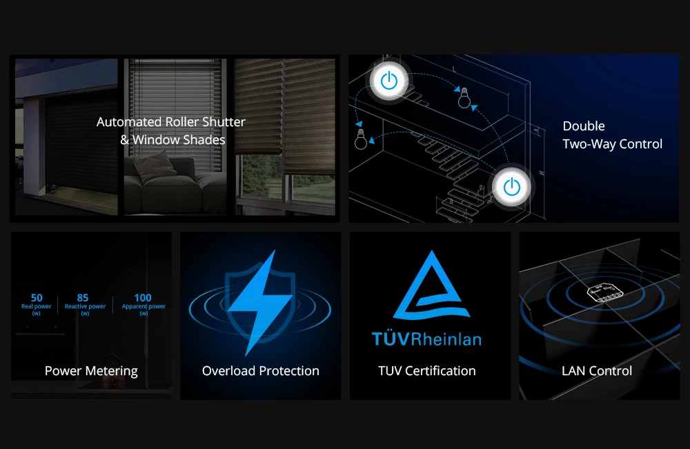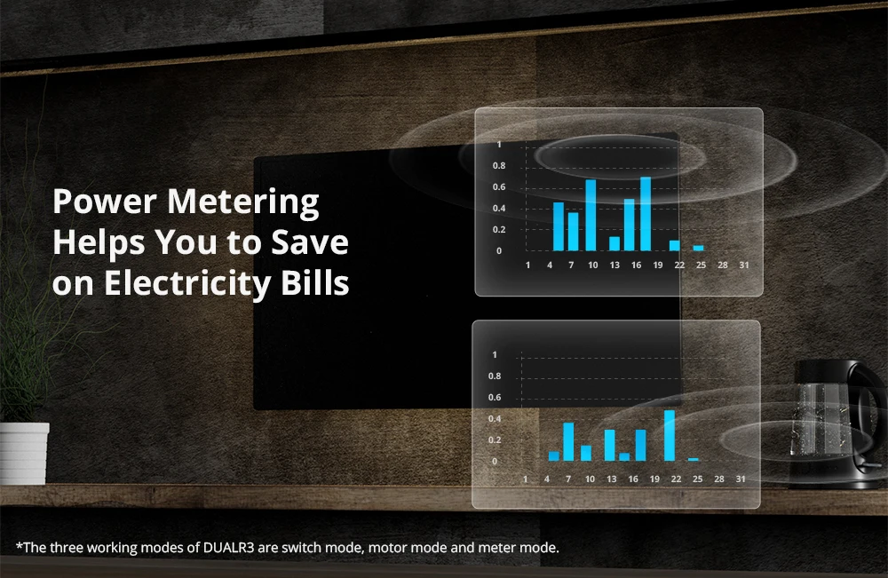 Three working modes available. DUALR3 comes with switch mode, motor mode and meter mode.One of the typical features is roller shutter and window shades smart control in the motor mode. The switch module offers the ultimate flexibility for your roller shutter and window shades by app remote control and scheduling timed events no matter whether you are home or away.