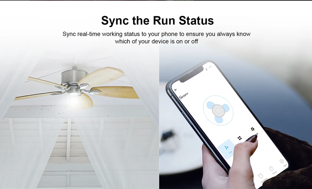 looking for a smart switch to easily control the ceiling fan with light being hung on the top? Stop seeking for! SONOFF iFan03/iFan04 is what you need. iFan03/iFan04, the new version of iFan02, more stable in performance, which is a Wi-Fi ceiling fan and light controller supported to control the ceiling fan with light using your phone wherever you are. Voice control is designed to make you easily command iFan03/iFan04 to turn on or off the fan and light, no need any manual operation. Support to control the ceiling fan with light from your phone wherever you are and whenever you want. Schedule for it to turn on and off at daytime or nighttime, or anytime throughout the day, and it will turn on or off automatically. Supplied with a RM433 remote controller where you can adjust the fan among the low, medium and high speed for getting different levels of cool feeling. The scenes feature in the app allows you to control one or multiple SONOFF devices, quickly and simultaneously with a single tap.