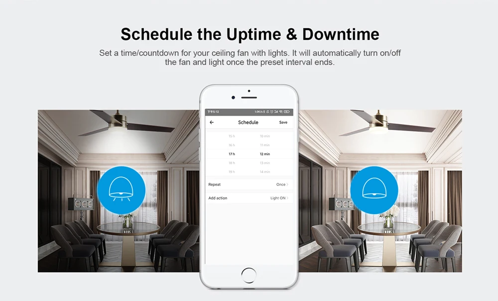 Set a time/countdown for your ceiling fan with lights. It will automatically turn on/off the light once the preset interval ends