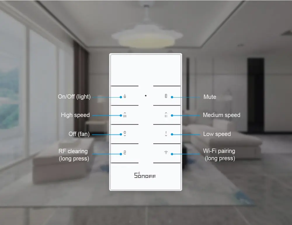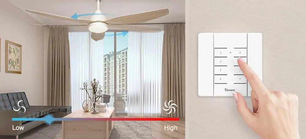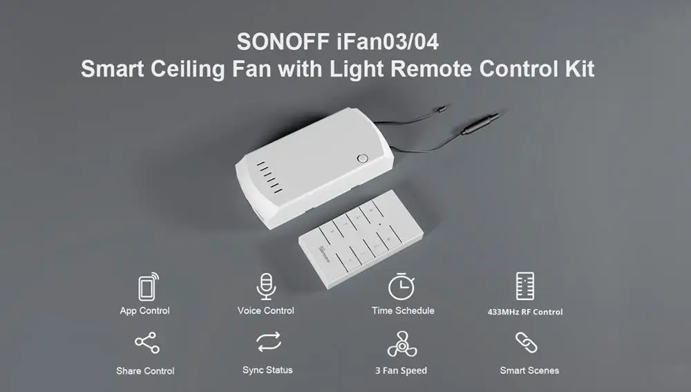 The SONOFF iFan03/iFan04 could be used with a 433 RF Remote, with whom you can turn on/off the fan and light, adjust fan speed indoors.