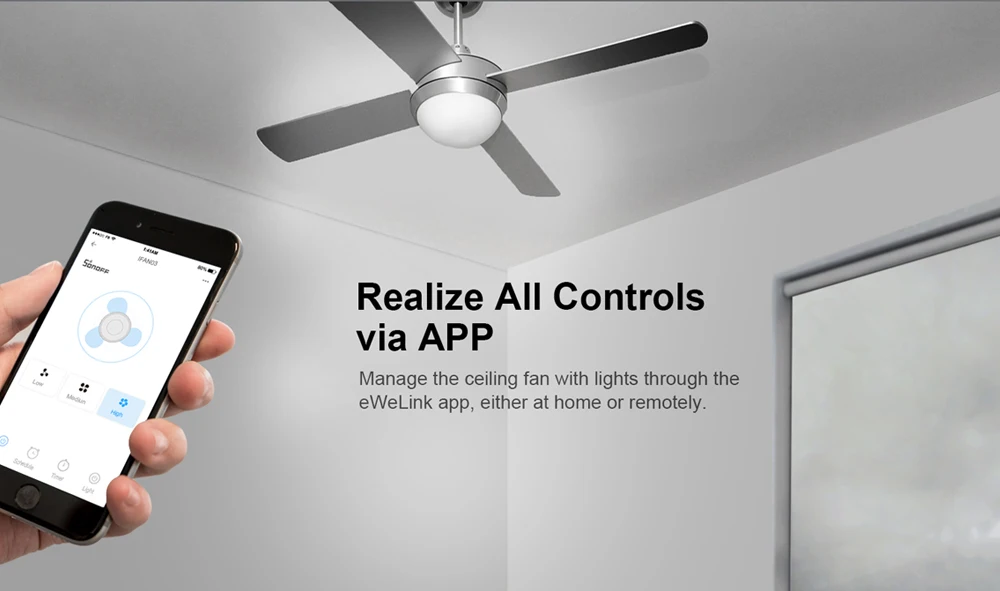 Manage the ceiling fan with lights through the eWeLink app, either at home or remotely
