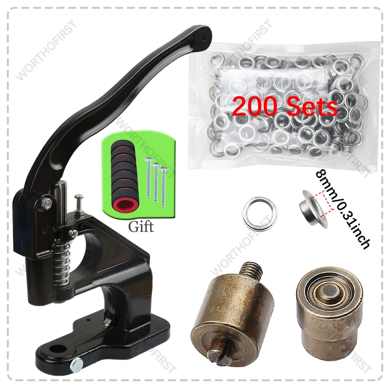 One hand press+one set eyelet installation mold+200 sets stainless steel eyelets (comes with 3 fixing screws + Anti slip handle cover as a gift)