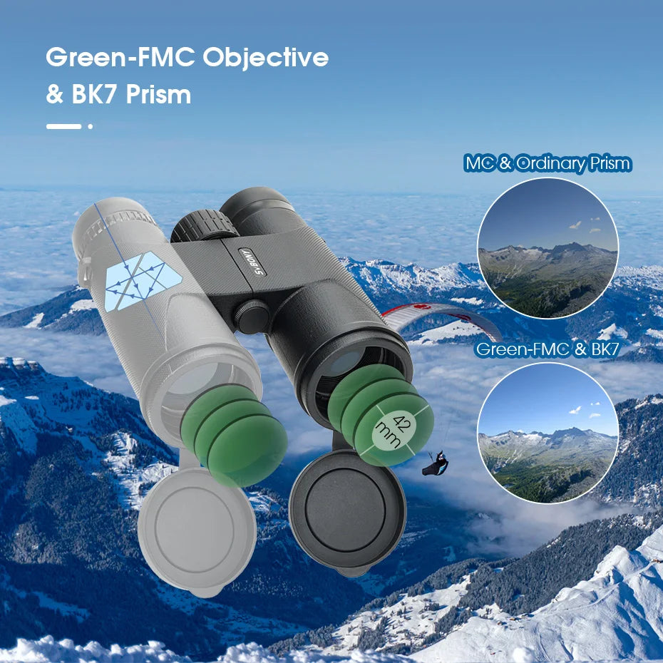 The 42mm green fully multi-coated objective lens and the BK7 prism ensure high transmittance for a brighter and clearer aperture, and providing clear, detailed and high contrast images and offering easeful observation experience even in low light conditions.
