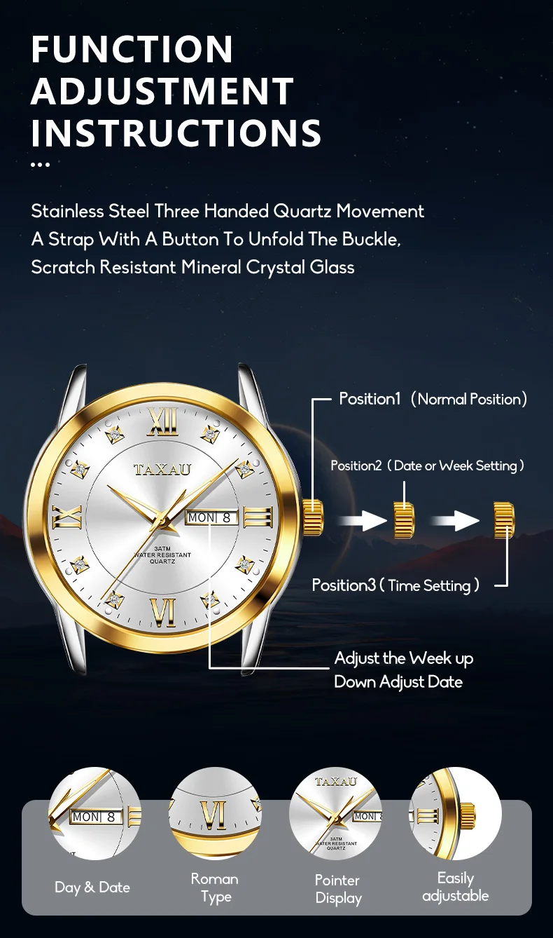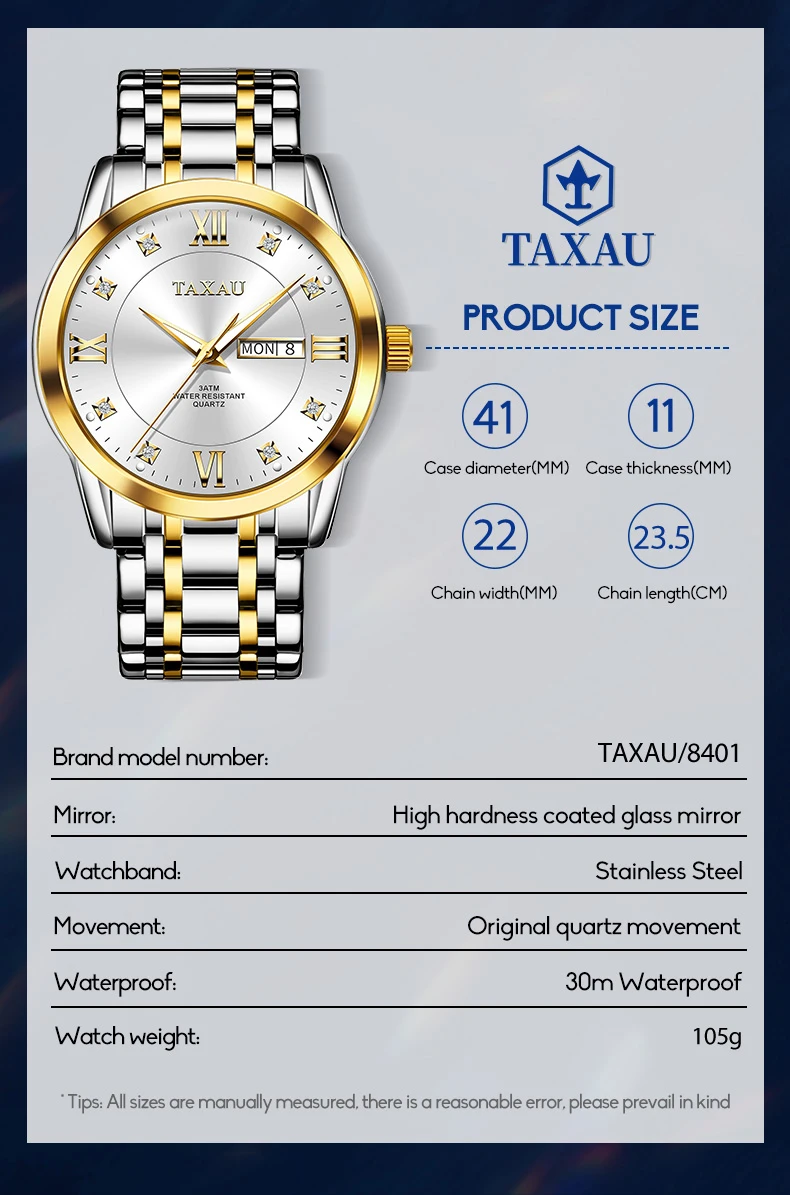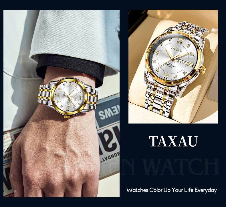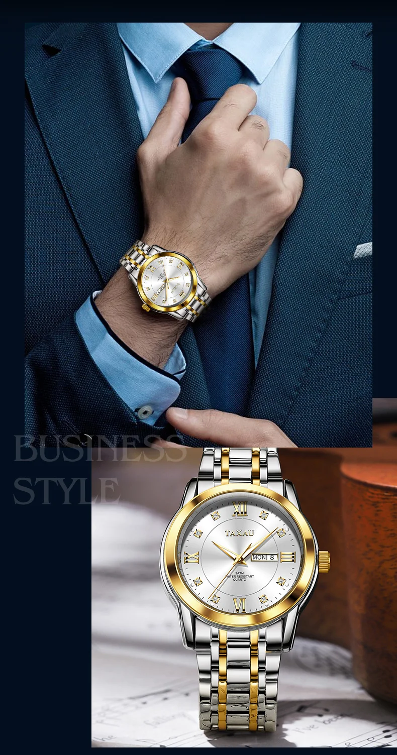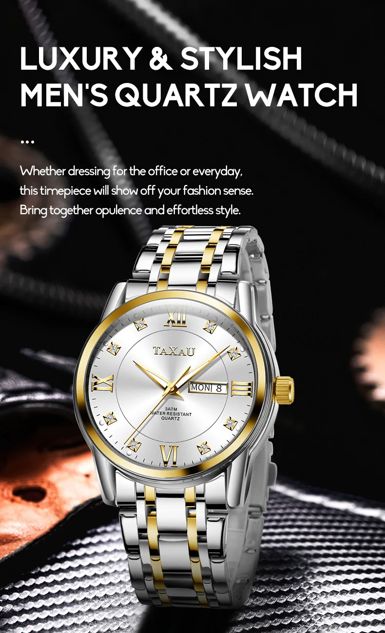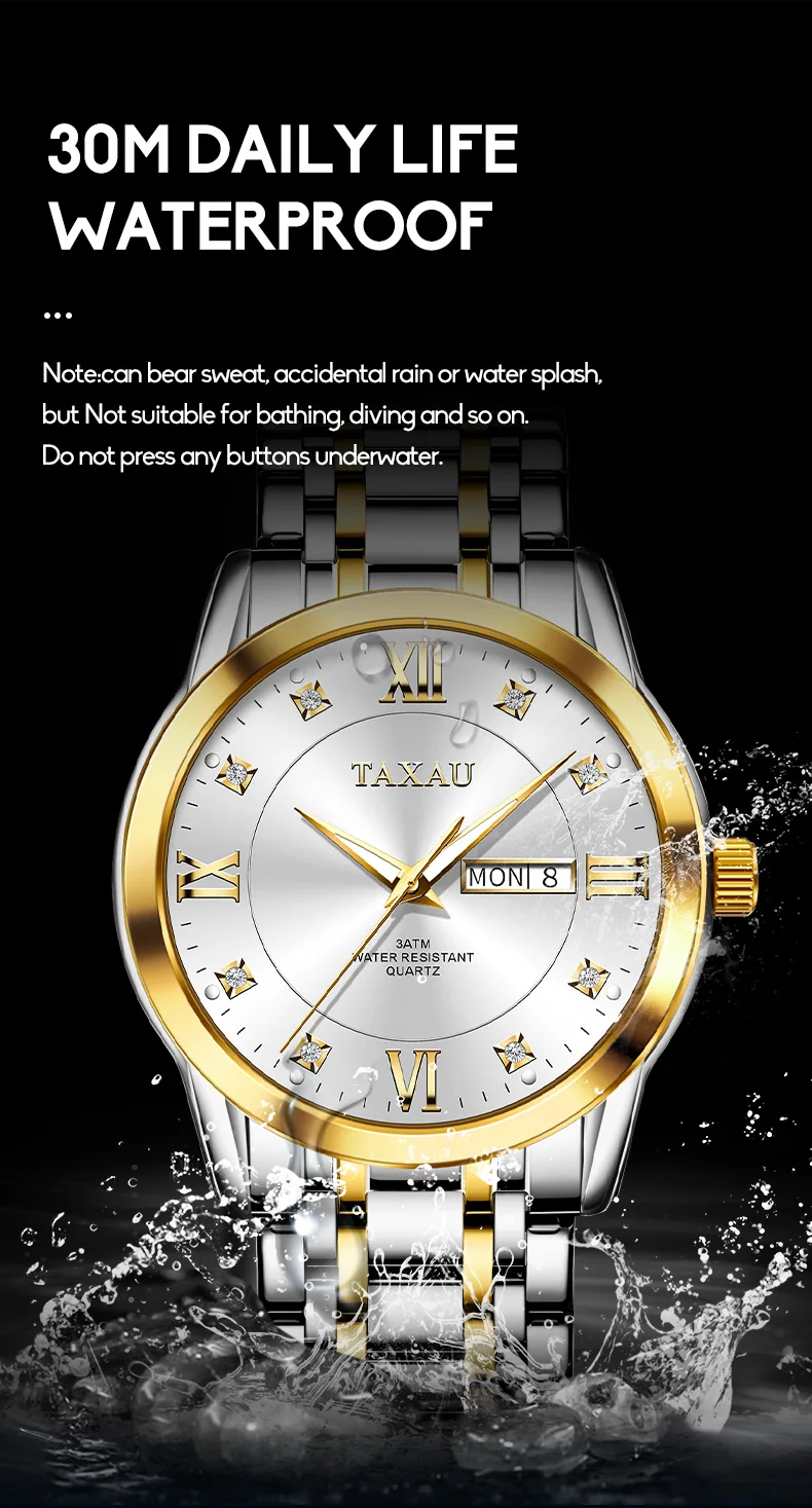 TAXAU Top Brand Watch for Men Stainless Steel Fashion Business Men's Wrist Watches Waterproof Luminous Dual Calendar Male Watch