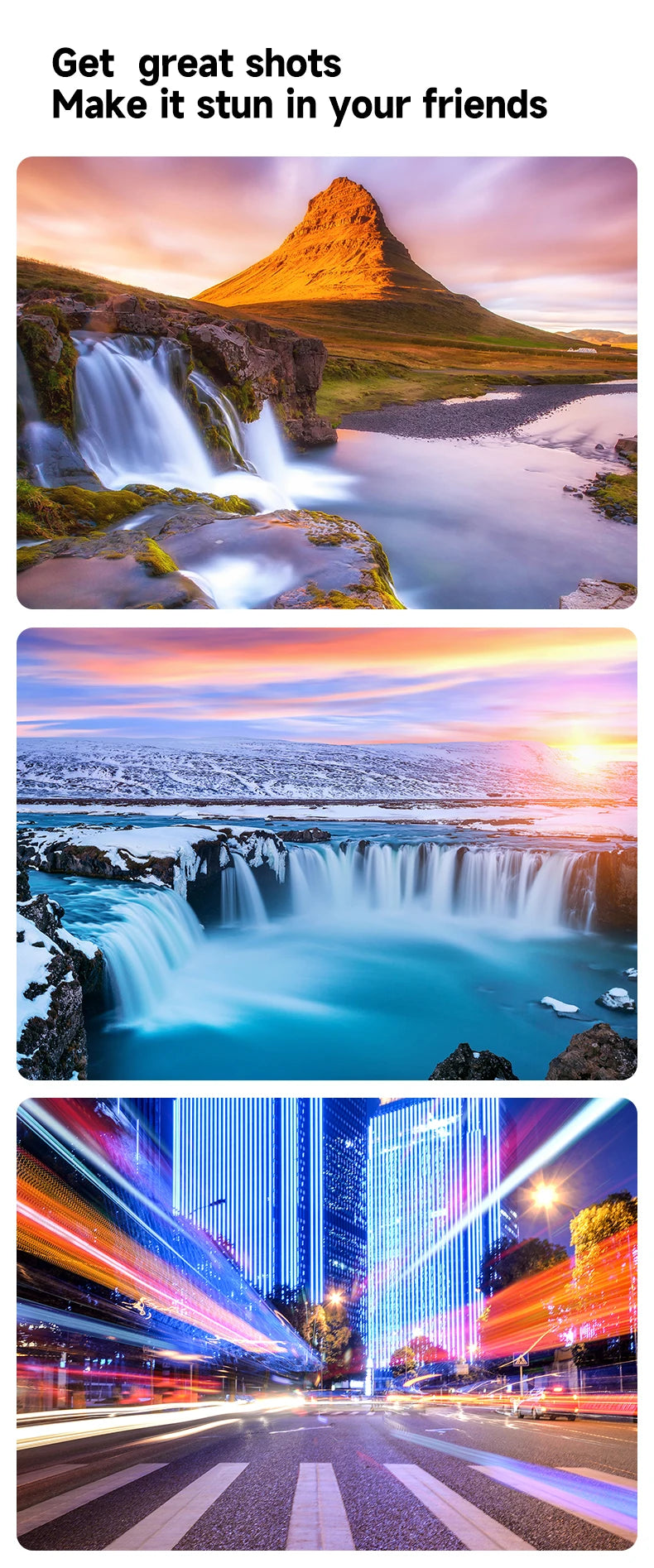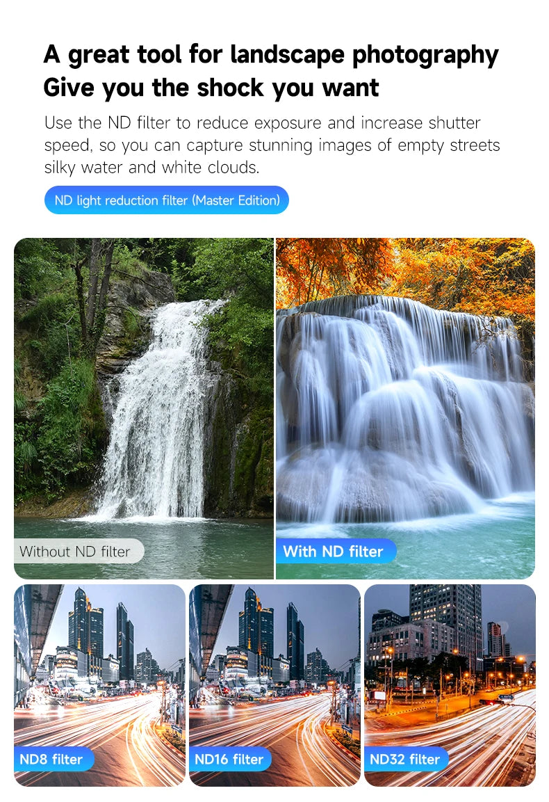5.A great tool for landscape photography Give you the shock you want Use the ND filter to reduce exposure and increase shutter speed, so you can capture stunning images of empty streets silky water and white clouds.