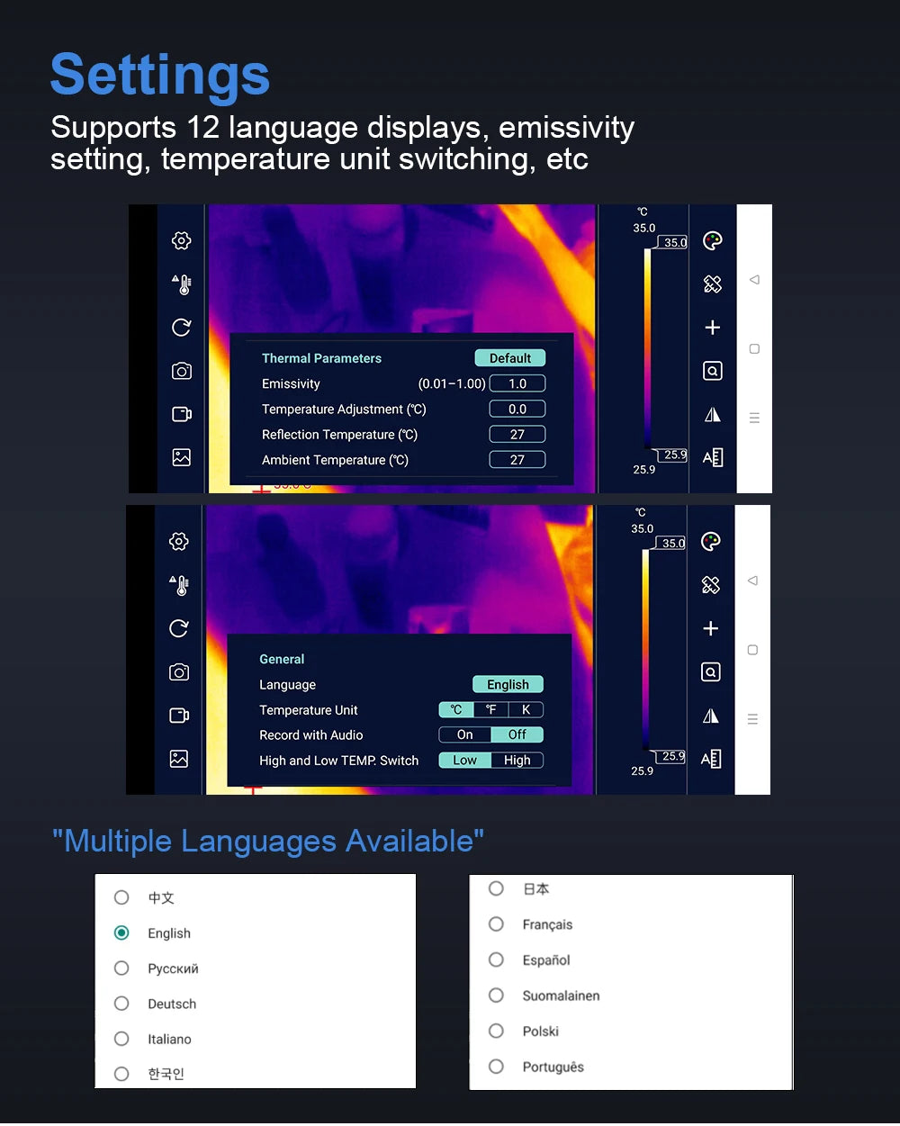 Used with mobile APP, it supports taking photos ,videos and storing them in the photo album, allowing professional thermal imaging analysis anytime and anywhere.