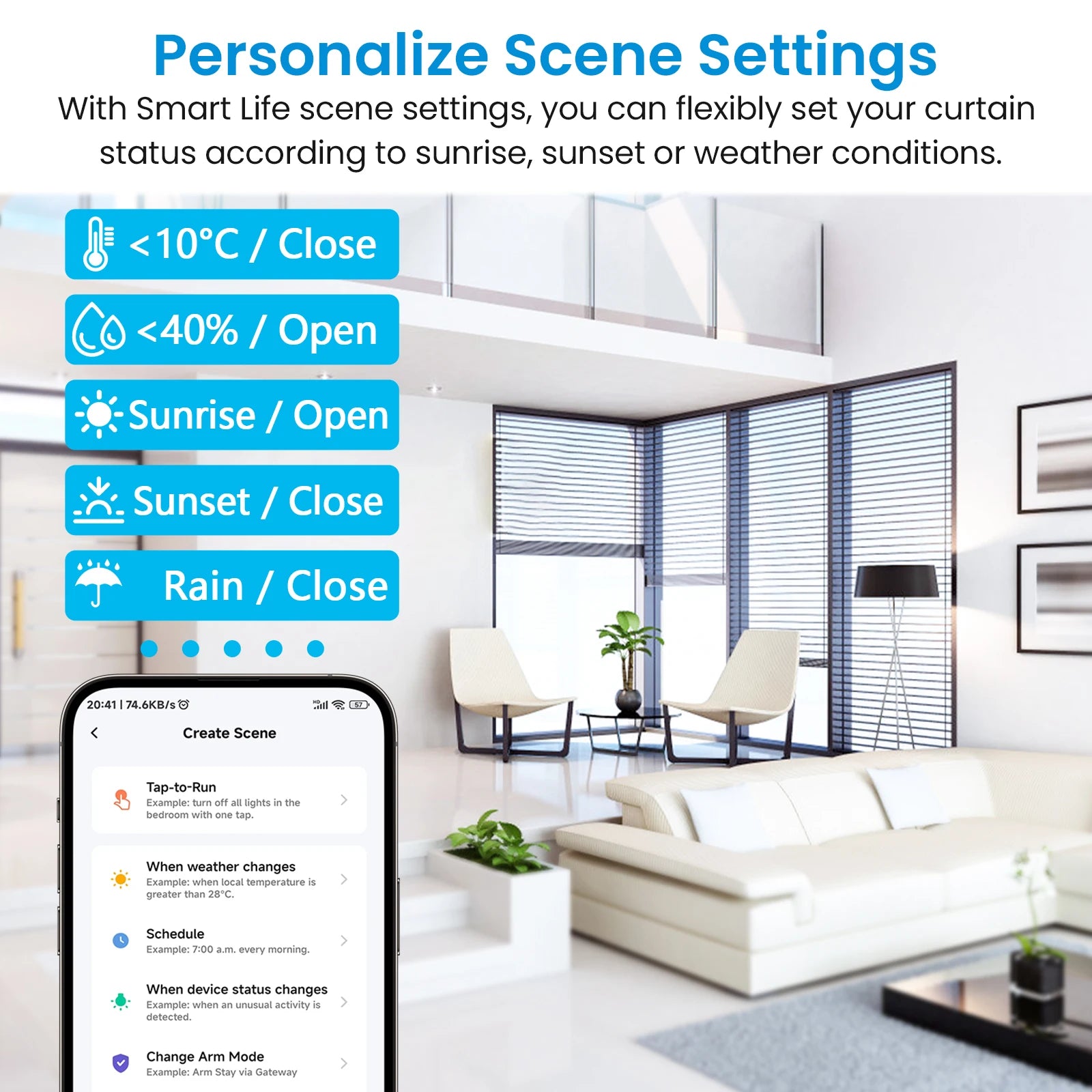 With Smart Life scene settings, you can flexibly set your curtain status according to sunrise, sunset or weather conditions.