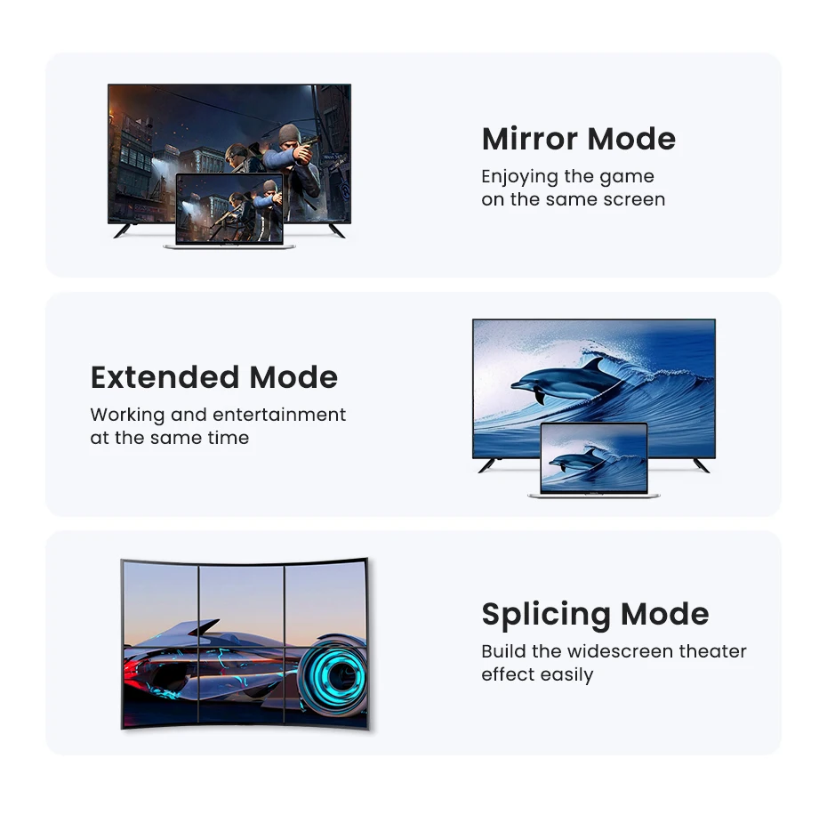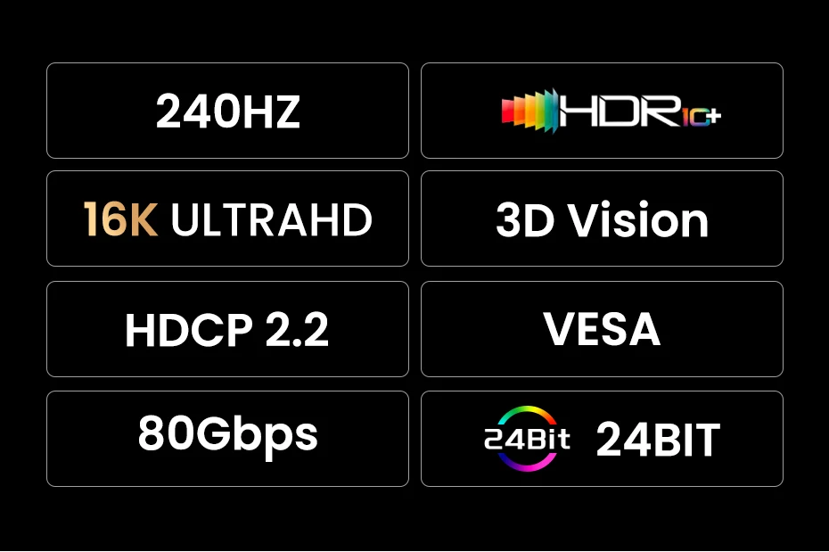 Resolution: 15360*8460@30Hz, 7680*4320@60Hz, 3840*2160@240Hz, 2560*1440@240Hz, 1920*1080@240Hz