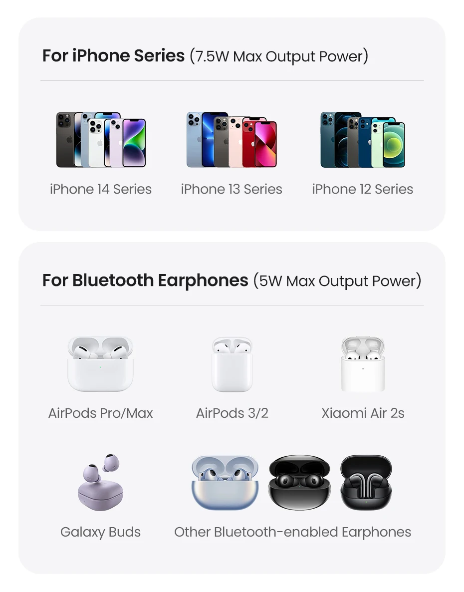 7.5W (max) output for iPhone series, 5W (max) output for AirPods.
