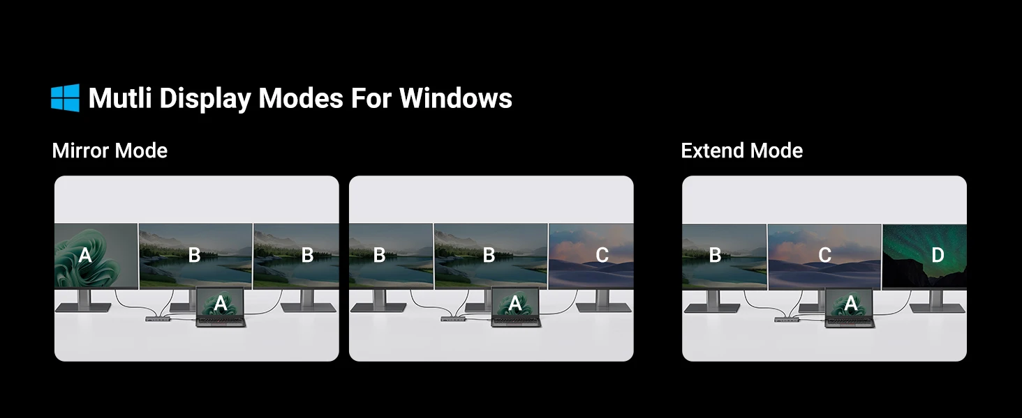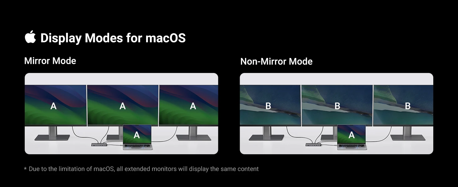When 2 or 3 monitors are connected to Mac, the docking station can only support extending one monitor, and the other monitor can only copy the monitor you extended, which means it only supports AAAA or ABBB. Do NOT support differential display (ABCD)