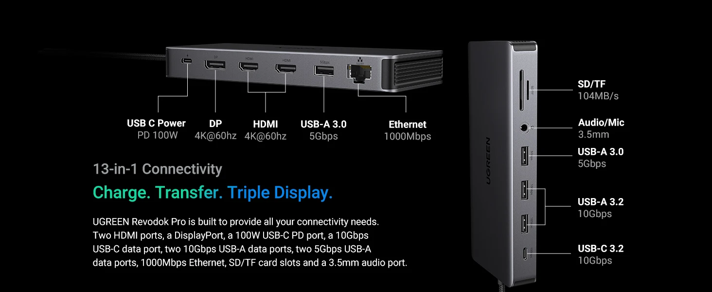 ✔13-in-1 USB C Docking Station: Inspire more potential of your laptop’s USB-C port with Two HDMI ports, a DisplayPort, a 10 Gbps USB-C 3.2 Gen 2 port, two 10 Gbps USB-A 3.2 Gen 2 ports, two USB A 3.0, 100W Power Delivery, RJ45 3.5MM and SD/Micro SD card reader.