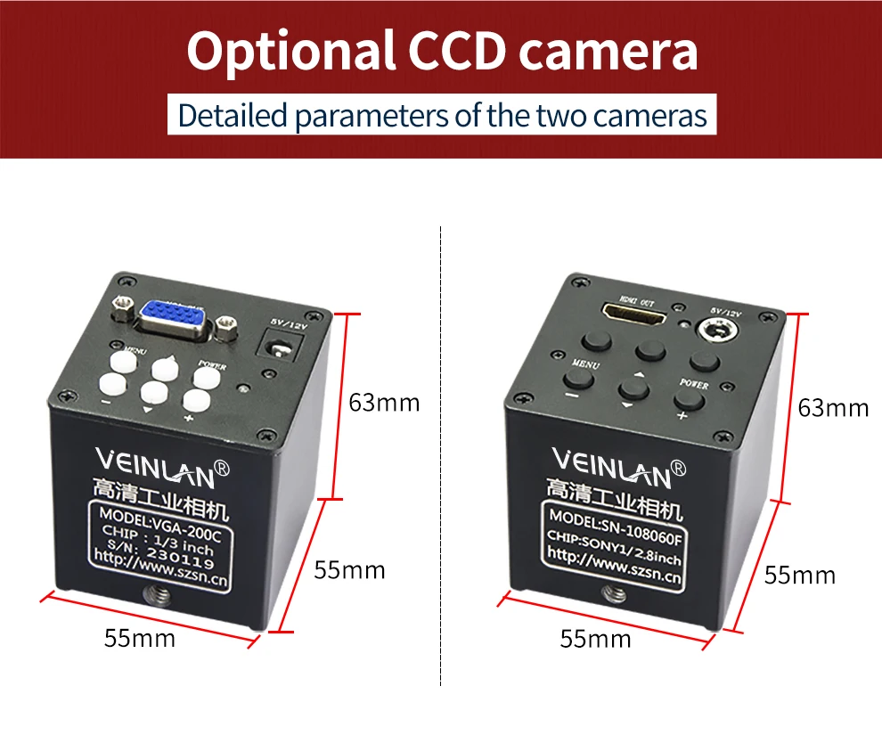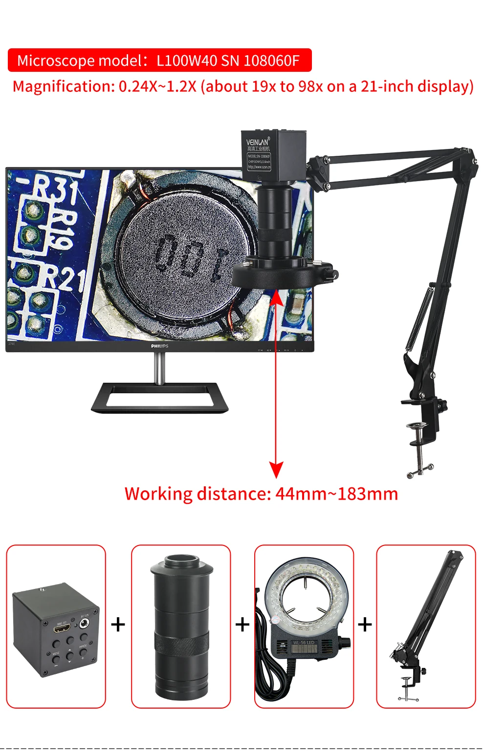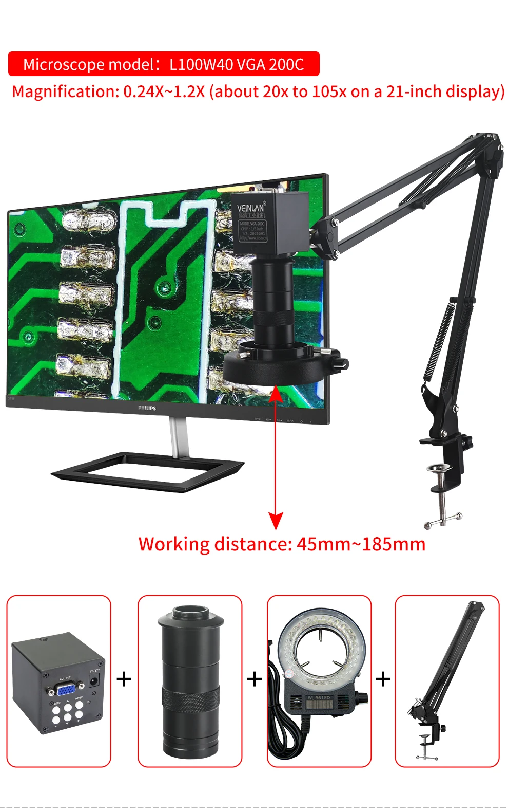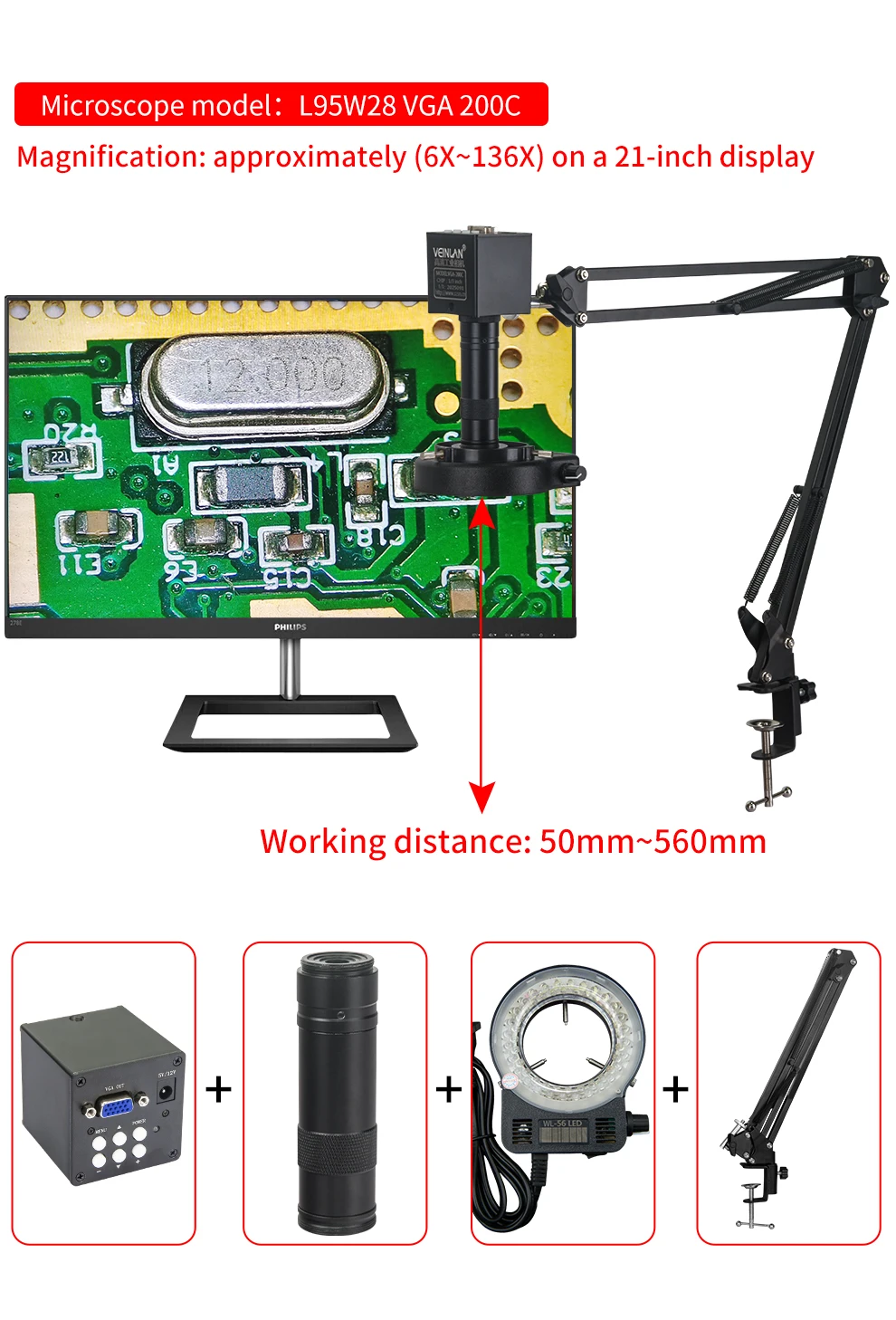 Video microscope, with magnification ranging from 1 to 150 times. Vga HDMI camera. Inspection of soldering and printing.