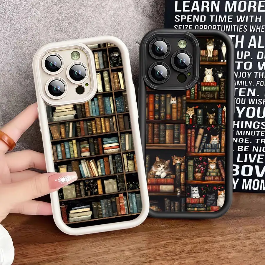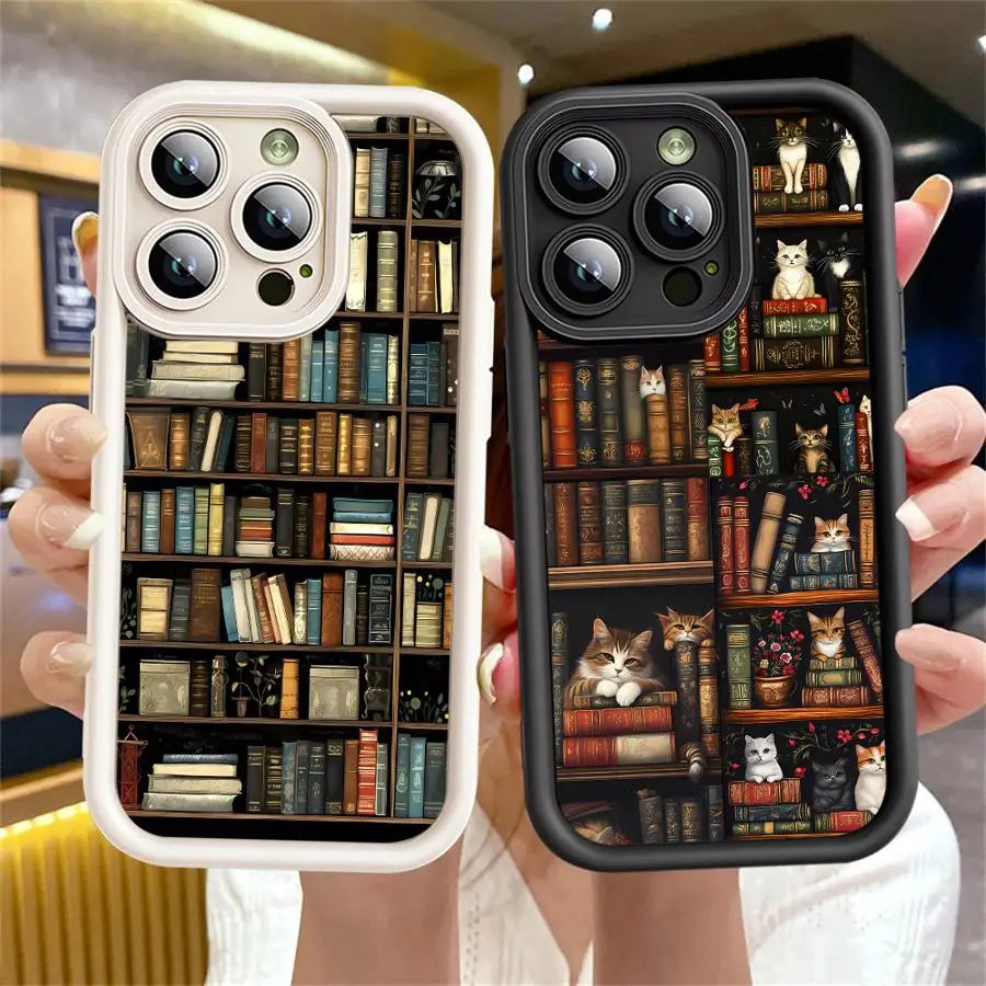 Vintage Bookshelf Kitten Phone Case for iPhone 16 15 Pro Max 13 12 11 14ProMax 16Plus 12Pro 16e Soft Cover