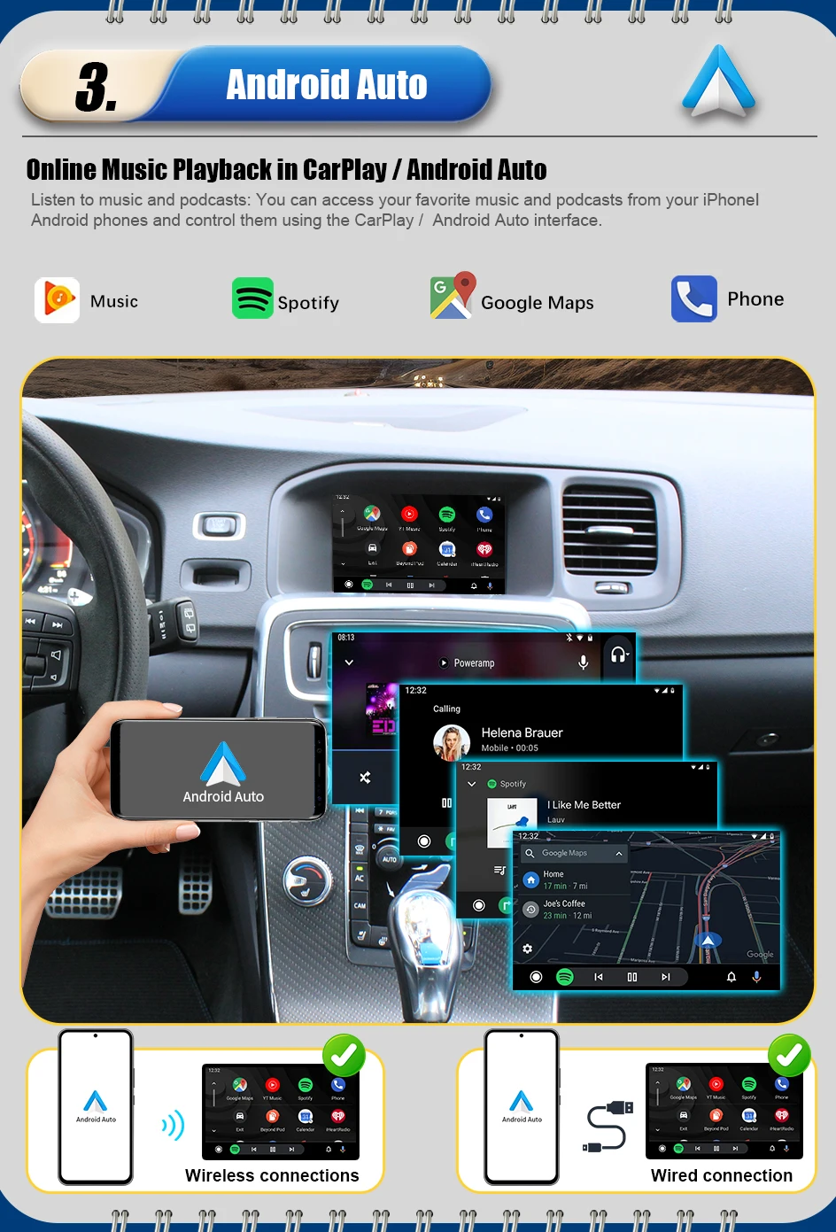 💘【Wireless / Wired Android Auto 】To use Android Auto features, just establish a wireless connection with your phone. allows you to use Google Assistant or Siri to access phone contacts, music, navigation, and other features so you can stay focused on the road and drive more intelligently and conveniently.