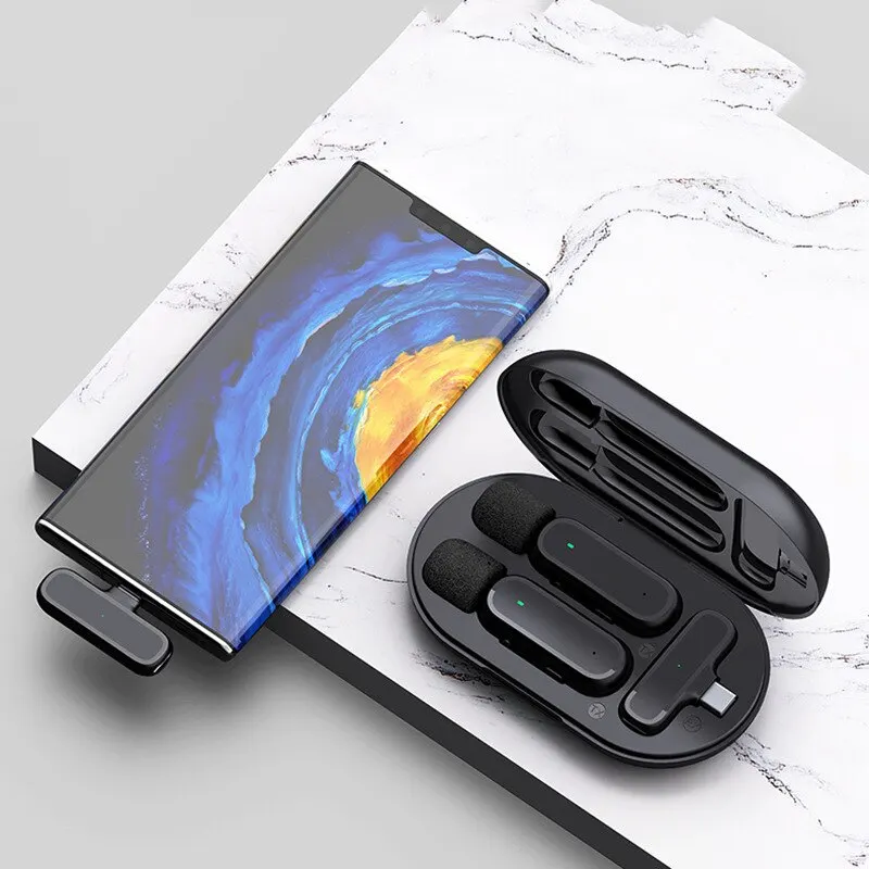 Wireless lavalier microphone with charger case portable audio video receiver mini mic for iPhone Android tablet gaming live