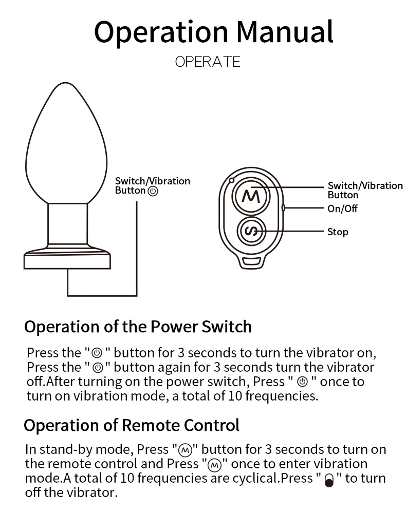 In stand- by mode, Press " M " button for 3 seconds to turn on the remote control and Press " M '"(once to enter vibration mode.A total of 10 frequencies are cyclical.Press " " to turn off the vibrator.