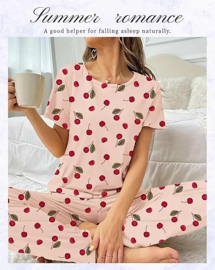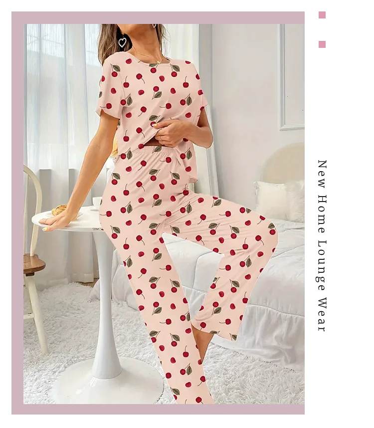 Soft and comfortable milk silk fabric, women's pajamas, round neck, short sleeves, cute cherry print, cute T-shirt top, elastic waistband, long pants, pajama 2-piece set