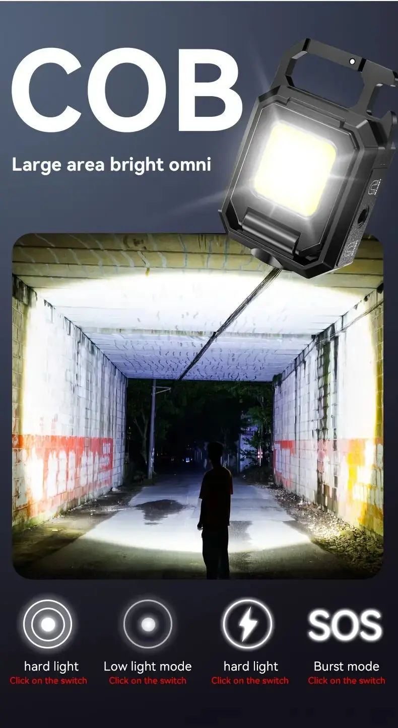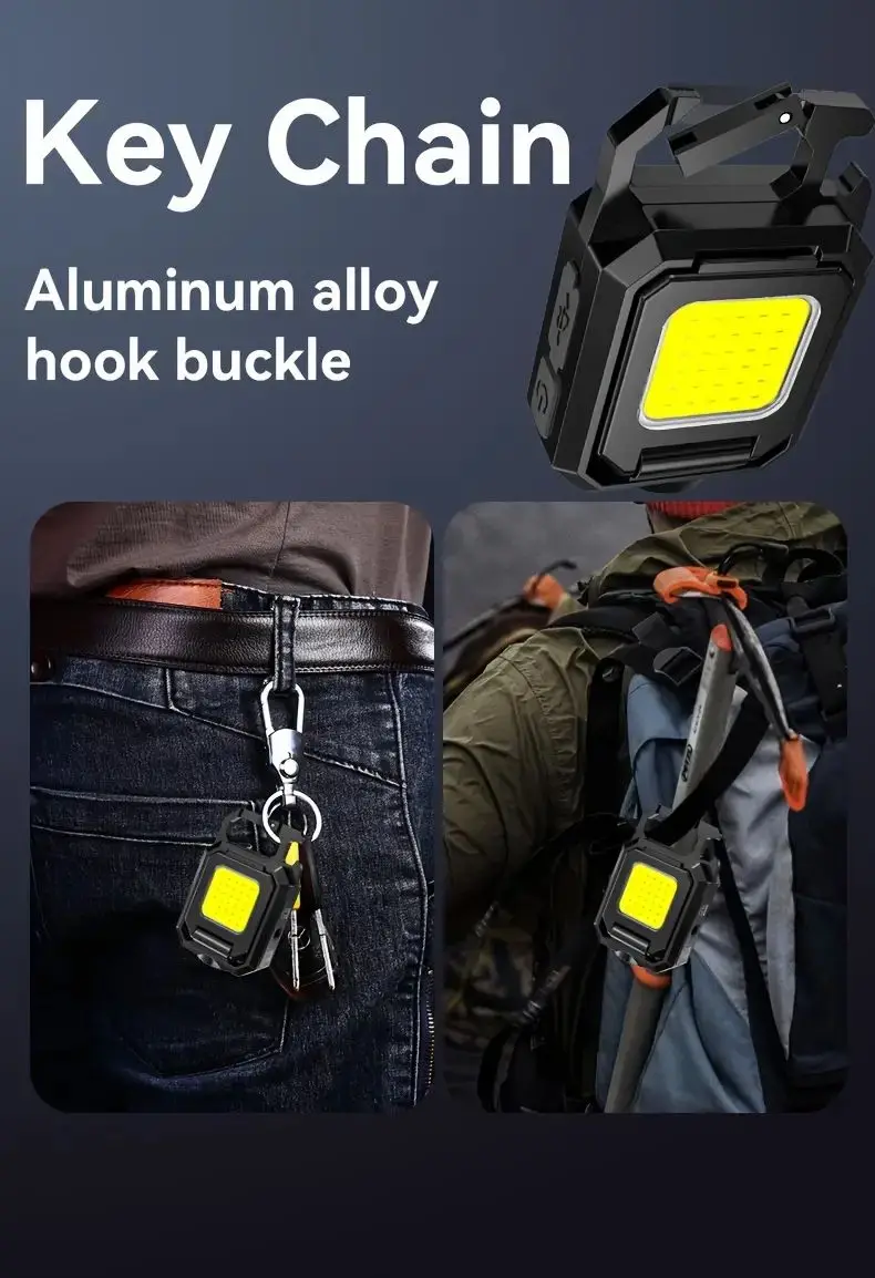 Feature: 1. Adjustable Light Panel: The light panel of this keychain light can be rotated up to 90 degrees, allowing you to adjust the direction of the light as needed. Enjoy flexible lighting options for various tasks. 2. Multiple Light Sources: This versatile pocket work light features both long-range and close-range lighting options, making it suitable for different requirements. Whether you need a focused beam or wider coverage, this flashlight has you covered. 3. Compact Size for Portability: With its compact size, this mini keychain light is easy to carry and store. It can fit in your pocket or be attached to your keychain, ensuring you always have a reliable source of light on hand. 4. Type-C USB Charging: The built-in Type-C USB charging port makes recharging this emergency lamp a breeze. Simply connect it to a power source with a Type-C cable, eliminating the need for extra batteries. 5. Waterproof Design: Designed to withstand everyday water exposure, this camping lightis rated as waterproof. You can confidently use it in wet conditions without worrying about damage to the device. Specification: Main material: aluminum alloy + ABS Product color: black Product size: approximately 75mm (2.95in) x 48mm (1.89in) x 25mm (0.98in) Net weight of product: approximately 55g Lamp bead parameters: Light bulb: XM-+ 2 * COB LED Gear: 4th gear: COB strong light - COB weak light - XPE strong light - flashing Zoom fashion: None Lumens: 1000 lumens Other parameters: Battery: Built in 800mAh polymer lithium battery Charging method: Type-C USB charging Waterproof grade: IPX4 Note: